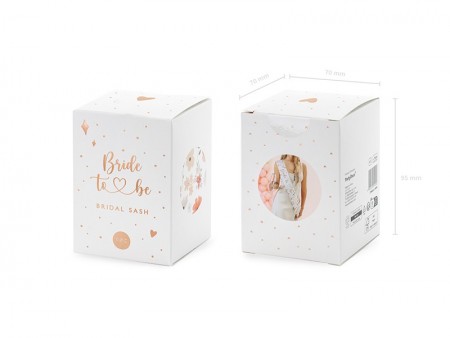 Echarpe en papier blanc Bride to be avec impression colorée et inscription métallisée en or rose, largeur 9,5 cm x longueur 76 cm environ.