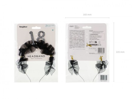 Bandeau avec un volant en tissu noir et le chiffre 18 décoré de perles. Taille totale environ 12 x 19,5 cm. Hauteur du chiffre environ 5,3 cm.