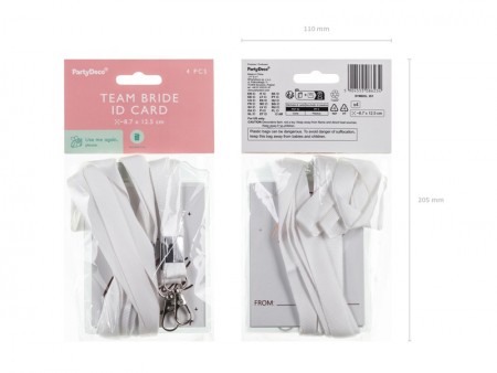 Badge Team Bride, dimensions approx. 8,7x12,5 cm. Le set contient 4 badges, chacun composé d'une plaque et d'un cordon.