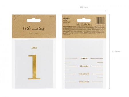 Numéros de table sous forme d'autocollants sur une bouteille, en papier blanc autocollant avec impression dorée, l'ensemble comprend les numéros de 1 à  15 et 15 mesures, dimensions environ 9,5 x 12 cm.
