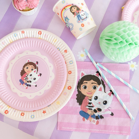 Dans des tons crème lumineux, elles représentent Gabby entourée de ses amis, avec un bel arc-en-ciel en arrière-plan. Ce design joyeux et coloré rend ces assiettes parfaites pour une décoration d’anniversaire complète et harmonieuse. Leur grand format permet de servir des plats salés, des snacks copieux ou encore de généreuses parts de gâteau.