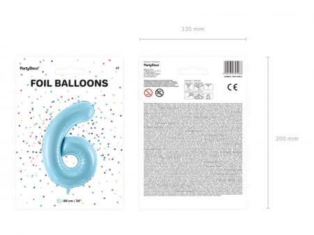 Ballon en aluminium pastel Chiffre 6 en bleu clair, taille avant gonflage env. 100 cm (39''), taille après gonflage env. 86 cm (34''). Peut être gonflé à  l'air et à  l'hélium. Le ballon est auto-scellant. Dispose de crochets pour faciliter le montage décoratif.