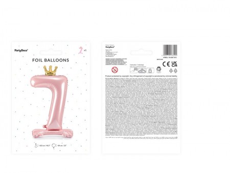 Ballon debout en métal Chiffre ''7'' de couleur rose clair avec une couronne dorée, taille dimensions avant gonflage e 103 cm (40.5''), taille dimensions après gonflagee 84 cm (33''). A gonfler avec de l'air.