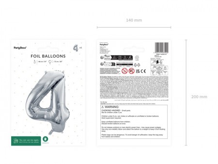 Ballon en aluminium métallisé Chiffre 4 en argent, taille avant gonflage env. 86 cm (34''), taille après gonflage env. 72 cm (28''). Peut être gonflé à  l'air et à  l'hélium. L'ensemble comprend une paille. Le ballon est auto-scellant. Dispose de crochets pour faciliter le montage décoratif.