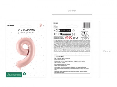 Ballon en aluminium pastel Chiffre 9 en rose clair, taille avant gonflage env. 86 cm (34''), taille après gonflage env. 72 cm (28''). Peut être gonflé à  l'air et à  l'hélium. L'ensemble comprend une paille. Le ballon est auto-scellant. Dispose de crochets pour faciliter le montage décoratif.