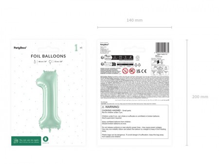 Ballon en aluminium pastel Chiffre 1 en vert, taille avant gonflage env. 86 cm (34''), taille après gonflage env. 72 cm (28''). Peut être gonflé à  l'air et à  l'hélium. L'ensemble comprend une paille. Le ballon est auto-scellant. Dispose de crochets pour faciliter le montage décoratif.
