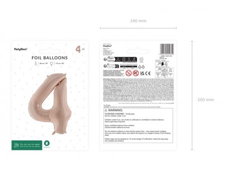 Ballon en aluminium mat Chiffre 4 en beige foncé, taille avant gonflage env. 86 cm (34''), taille après gonflage env. 72 cm (28''). Peut être gonflé à  l'air et à  l'hélium. L'ensemble comprend une paille. Le ballon est auto-scellant. Dispose de crochets pour faciliter le montage décoratif.