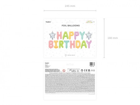 Ballon en Mylar ''Happy Birthday'', de couleurs mélangées (jaune, rose clair, vert clair, menthe, lilas), avec 2 étoiles iridescentes, dimensions approx. 395 x 35 cm (155,5 x 14'').
