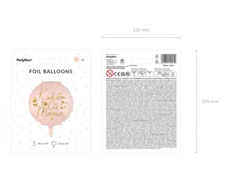 Ballon en Mylar rond de couleur rose avec inscription dorée ''Kocham CiÄ™ Mamo'', dimensions : hauteur avant gonflage environ 45 cm (18''), dimensions après gonflage environ 35 cm (14''). A gonfler avec de l'air ou de l'hélium.