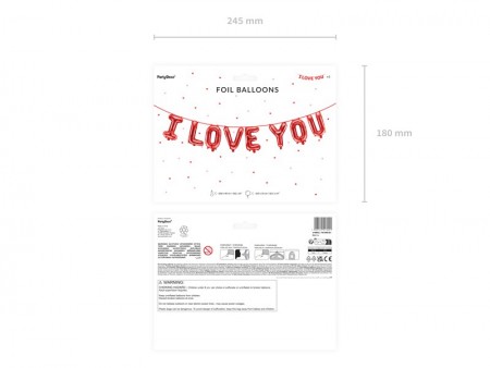 Ballon en aluminium rouge métallisé avec inscription I love you, dimensions du ballon dégonflé : 260 x 40 cm (102 x 40cm) et 210 x 35 cm (82,5 x 14'') environ une fois gonflé. Gonflé à  l'air. Le lot comprend une paille et une ficelle de 3 m environ.