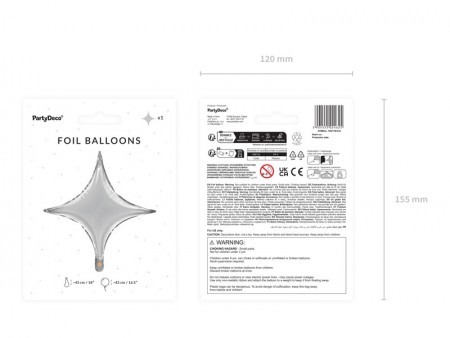 Ballon en Mylar étoile à  4 branches en argent, taille avant gonflage env. 45 cm (18''), taille après gonflage env. 42cm (16.5''). Infalte avec de l'air. L'ensemble contient une paille.