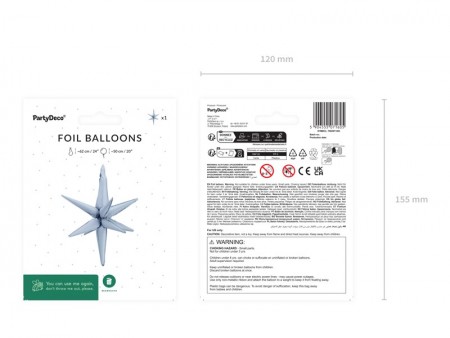 Ballon en aluminium 3D Etoile de couleur bleu brumeux, taille avant gonflage env. 53 x 62 cm (21 x 24''), taille après gonflage env. 50 cm (20''). à€ gonfler avec de l'air. Le set comprend une paille.