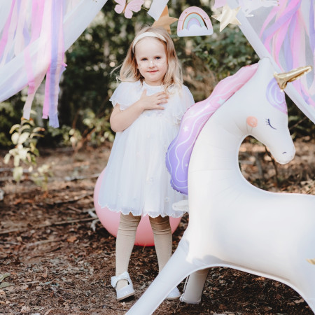Ballon en aluminium autoportant, licorne beige, avec détails dorés et arc-en-ciel. Dimensions avant gonflage : 104 x 117 cm, après : 95 x 86 cm.
