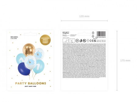 Ballons Strong avec impressions Roczek, le set contient 6 ballons (2 ballons Pure White Pastel avec impression couleur, 2 ballons Light Blue Pastel avec impression blanche, 1 ballon Royal Blue Pastel et 1 ballon Gold Glossy), diamètre environ 30 cm.