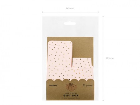 Boîtes en rose pâle avec des points dorés, dimensions après pliage environ 6 x 3,5 x 5,5 cm.