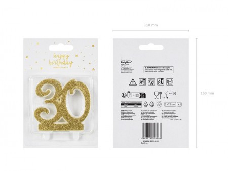Bougie d'anniversaire Chiffre 30 en paillettes dorées, taille environ 7,5 cm.