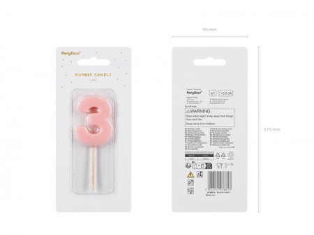 Bougie d'anniversaire Chiffre 3, de couleur rose clair, dimension environ 5.5 cm