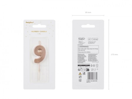 Bougie d'anniversaire Chiffre 9 en or rose sur un bâton en bois, hauteur du chiffre environ 4,5 cm, hauteur totale environ 9 cm.