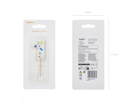 Bougie d'anniversaire Chiffre 1 en blanc avec des confettis sur un bâton en bois, hauteur du chiffre environ 5,5 cm, hauteur totale environ 10 cm.
