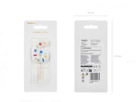 Bougie d'anniversaire Chiffre 6 en blanc avec des confettis sur un bâton en bois, hauteur du chiffre environ 5,5 cm, hauteur totale environ 10 cm.