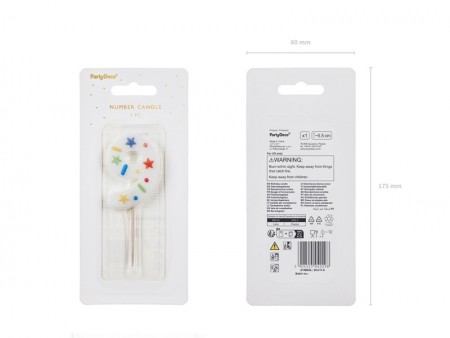 Bougie d'anniversaire Chiffre 9 en blanc avec des confettis sur un bâton en bois, hauteur du chiffre environ 5,5 cm, hauteur totale environ 10 cm.