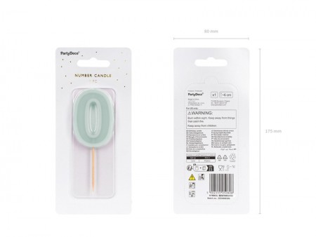 Bougie d'anniversaire numéro 0 en menthe légère, taille environ 6 cm, hauteur avec bâtonnet environ 10 cm. Chaque bougie est munie d'un bâtonnet en bois.