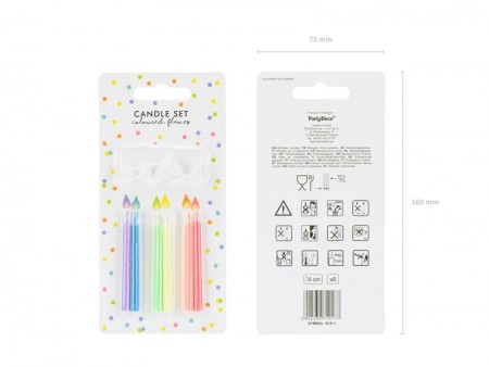 Bougies d'anniversaire Flammes colorées, mélange de 6 couleurs, après allumage elles brûlent avec des flammes colorées, taille environ 6 cm, set de 6 bougies et 6 bases.
