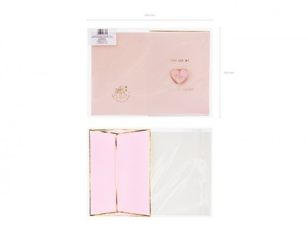 Carte de couleur rose avec impression métallique dorée, épingle - cœur avec le mot Maman et enveloppe rose avec impression métallique dorée, taille de la carte environ 10,5 x 14,8 cm, taille de l'épingle environ 3 x 2,7 cm.