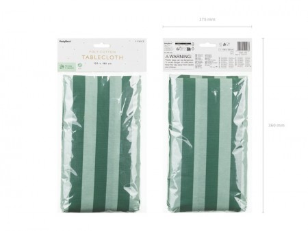Nappe jetable, unilatérale, rectangulaire de dimensions 180 x 120 cm en rayures vertes avec impression d'étriers dorés. Nappe réalisée en matériau synthétique.