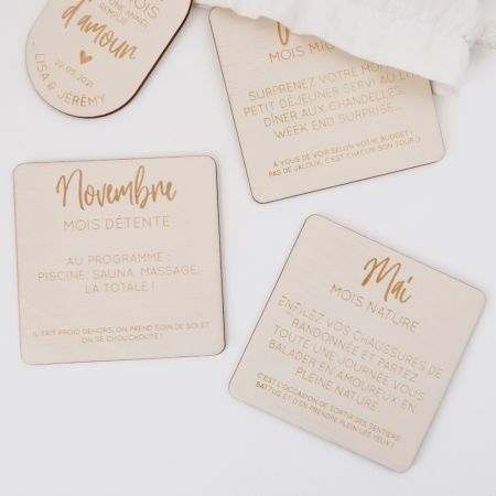 Vendu dans son petit pochon blanc en coton bio, ce jeu est constitué de 12 cartes en bois à message et d'une belle étiquette personnalisable avec deux prénoms et une date (mariage, rencontre...)