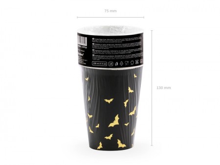 Gobelets en papier Trick or Treat, noirs avec un motif doré, capacité d'environ 220 ml. Les Gobelets EU portent les marquages requis par le règlement d'exécution 2020/2151 de la Commission Européenne du 17 décembre 2020 établissant des règles concernant les spécifications harmonisées relatives à  l'étiquetage des produits en plastique à  usage unique figurant dans la partie D de l'annexe de la directive 2019/904 du Parlement Européen et du Conseil Européen relative à  la réduction de l'impact environnemental de certains produits en plastique. Le produit comprend une étiquette uniquement en polonais, allemand, tchèque, français, néerlandais, slovaque, slovène et bulgare.