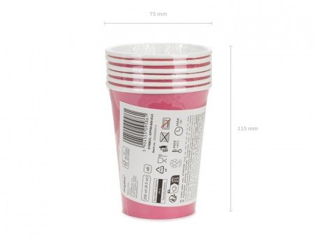Gobelets en papier de couleur rose foncé. Hauteur env. 9 cm, capacité env. 250 ml (8.5 oz). Produit jetable. Ne pas utiliser pour les boissons chaudes.Les Gobelets portent les marquages requis par le règlement d'exécution de la Commission (UE) 2020/2151 du 17 décembre 2020 fixant des règles sur les spécifications harmonisées concernant l'étiquetage des produits en plastique à  usage unique figurant à  la partie D de l'annexe de la directive (UE) 2019/904 sur la réduction de l'impact de certains produits en plastique sur l'environnement. Le produit contient uniquement une étiquette en polonais, allemand, tchèque, français, néerlandais, slovaque, slovène et bulgare.