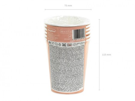 Gobelets en papier de couleur or rose, capacité environ 220 ml. Les Gobelets EU portent les marquages requis par le règlement d'exécution 2020/2151 de la Commission Européenne du 17 décembre 2020 établissant des règles concernant les spécifications harmonisées relatives à  l'étiquetage des produits en plastique à  usage unique figurant dans la partie D de l'annexe de la directive 2019/904 du Parlement Européen et du Conseil Européen relative à  la réduction de l'impact environnemental de certains produits en plastique. Le produit comprend une étiquette uniquement en polonais, allemand, tchèque, français, néerlandais, slovaque, slovène et bulgare.