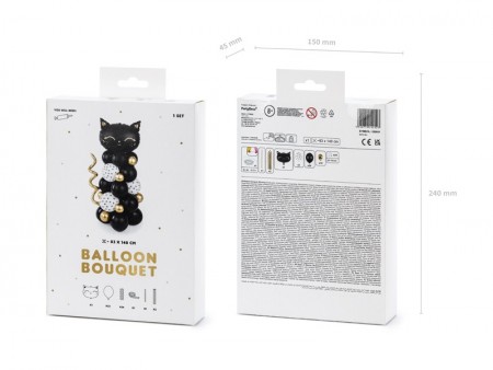 Bouquet de ballons Chat, de couleur noir, le lot contient : ballons en latex (33 pcs.), ballons à  sculpter (2 pcs.), ballon en aluminium (1 pcs.), paille en papier (1 pcs.), ruban adhesif en mousse (24 pcs.) et 2.5 m de ruban. Instructions comprises