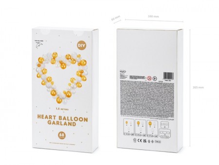 Guirlande de ballons blanche et or avec un cadre - cœur, le set contient 68 ballons en latex (22 pcs en Pastel Pure White, 23 pcs en Metallic Pure White, 23 pcs en Metallic Gold), 16 éléments en carton, 20 autocollants double-face, instructions. Dimensions après pliage : environ 166 x 160 cm. Instruction incluse. Instructions comprises.