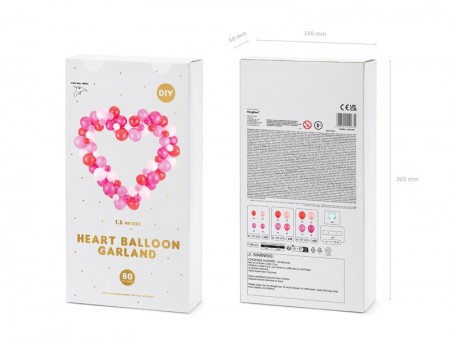 Guirlande de ballons rose avec un cadre - c?ur, le set contient 80 ballons en latex (20 pcs en Poppy Red, 20 pcs en Pale Pink, 20 pcs en Fuchsia, 20 pcs en Hot Pink), 16 éléments en carton, 20 autocollants double-face, instructions. Dimensions apr?s pliage : environ 166 x 160 cm. Instructions comprises.