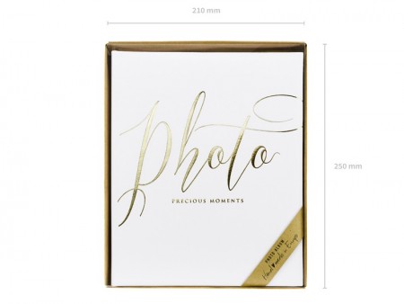 Album photo relié en papier blanc avec inscription dorée Photo, moments précieux, dimensions environ 20 x 24,5 cm, 22 pages.
