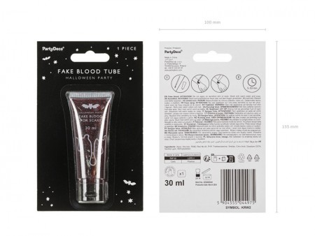 Faux sang en tube de 30 ml. Application facile et consistance gélifiée permettant d'obtenir des effets réalistes. Parfait pour créer des gouttes sur la peau. Ingrédients : Eau - 55,7 %, Glucose - 32,8 %, PVP - 3,5 %, Triéthanolamine - 2,3 %, Shellac - 1 %, Acide citrique - 0,3 %, Disodium EDTA - 0,3 %, Gomme xanthane - 0,16 %, Methylparaben - 0,14 %, FD&C Rouge No.40 - 3,8 %. Testé dermatologiquement. Ne pas appliquer sur la peau sensible ou les yeux. Laver avec de l'eau tiède et du savon.
