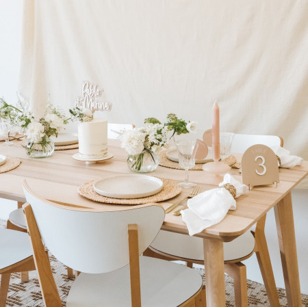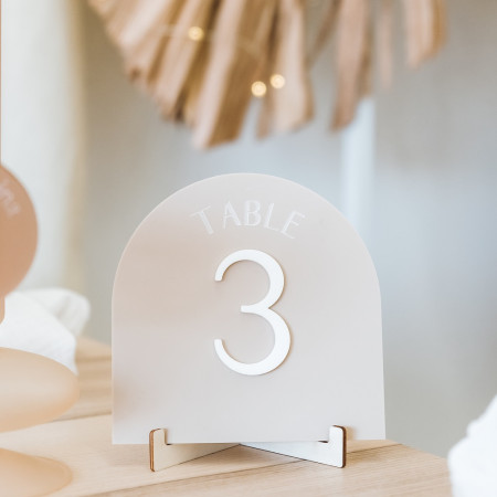 Pour un nom de table tendance et élégant, cette petite pancarte en plexiglas de couleur sable et chiffre blanc sera parfaite !