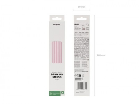 Pailles en plastique de couleur rosa, diamètre env. 7 mm, longueur env. 23 cm. Le set comprend une brosse de nettoyage. Produit réutilisable.