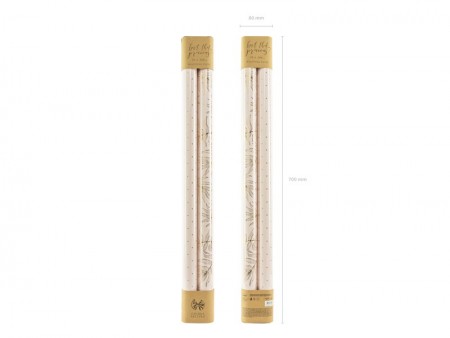 Papier d'emballage de couleur rose avec des motifs métalliques dorés (feuilles et points), largeur environ 70 cm, longueur environ 200 cm.