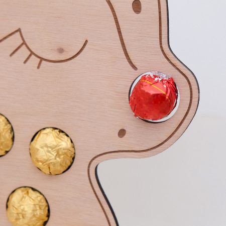 24 trous d'environ 3cm de diamètre vous permettent d'y glisser des chocolats (non inclus) du type rocher chocolat ou boule chocolatée du diamètre adéquat.