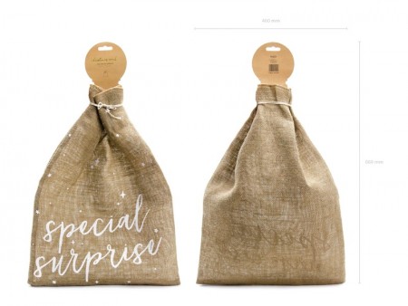 Sac en jute avec impression blanche et inscription Special Surprise, l'ensemble comprend le sac et environ 1 m de ficelle de jute, dimensions environ 40 x 55 cm.