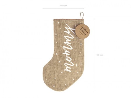 Chaussette de décoration ''Mommy'' blanc, en jute avec impression blanche et l'inscription Mommy, dimensions environ 23 x 39,5 cm.