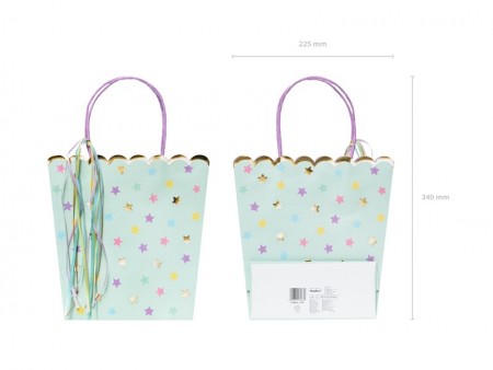 Sacs cadeaux Etoiles de couleur menthe avec impression métallique colorée et dorée, Rubans tissu colorés et impression violette à  l'intérieur des sacs, dimensions sans poignées environ 22 x 23 x 8 cm.