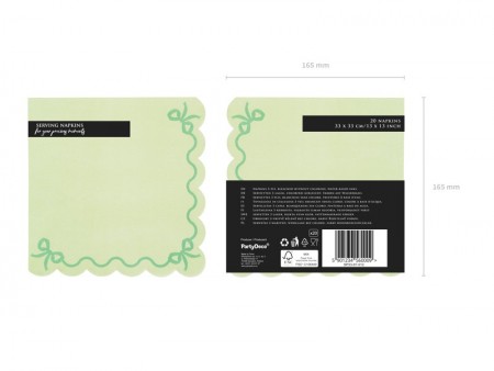 Serviettes en papier de couleur verte avec une finition à  volants. Les serviettes ont une impression de ruban avec un nœud. Dimensions dépliées : env. 33 x 33 cm, dimensions pliées : env. 16,5 x 16,5 cm.