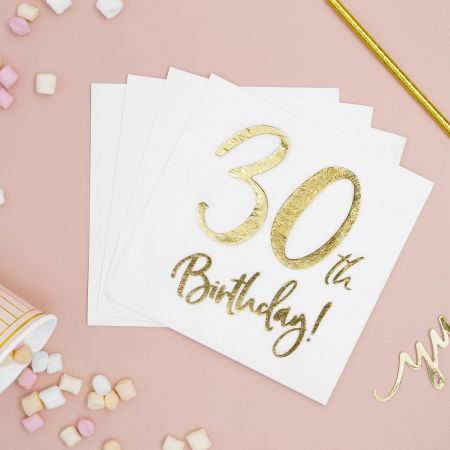 Serviettes de table en papier pour le 30e anniversaire en blanc avec motif doré, dépliées environ 33 x 33 cm, pliées environ 16,5 x 16,5 cm.